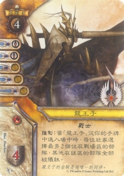 :当「龙王子」从你的手牌中进入场中时,每位玩家选择最多2个位在战场区的部队,其他在该区的部队全部被牺牲。