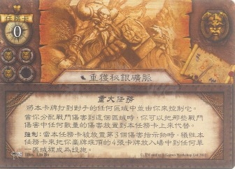 强制:当本任务卡被放置第3个伤害指示物时,牺牲本任务卡来把你弃牌顶的4张卡牌放入场中的任何单一区域里成为设施。