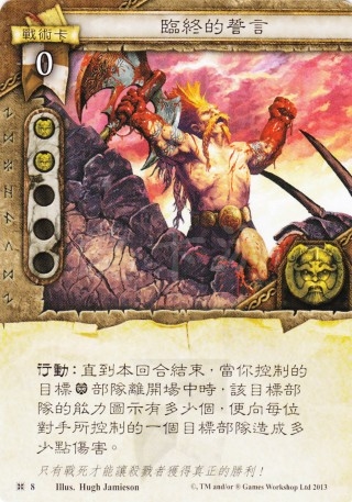 功能说明行动:直到本回合结束,当你控制的目标矮人部队离开场中时,该目标部队的能力图示有多少个,便向每位对手所控制的一个目标部队造成多少点伤害。
