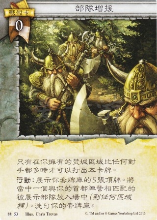 行动:展示你套牌库的5张顶牌。将当中一个与你的首都阵营相匹配的被展示部队放入场中(到任何区域里)。洗匀你的套牌库。