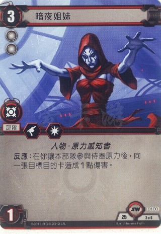 :在你让本部队参与侍奉原力后,向一张目标目的卡造成1点伤害。