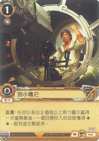 反应:在你以多出2个或以上原力图示赢得一次优势战后,一个目标投入的部队获得