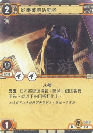 :在本部队进场后,弃掉一个印制费用为2或以下的目标强化卡。