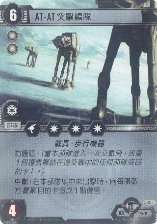 防护盾。(当本部队进入一次交战时,放置1个护盾标志在这交战中的任何部队或目的卡上。)