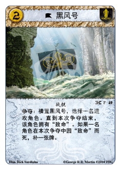 :横置黑风号,选择一名进攻角色。直到本次争夺结束,该角色拥有“致命”。如果一名角色在本次争夺中因“致命”而死,补一张牌。