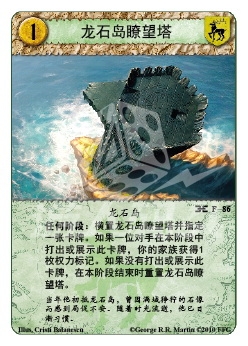 :横置龙石岛瞭望塔并指定一张卡牌。如果一位对手在本阶段中打出或展示此卡牌,你的家族获得1枚权力标记。如果没有打出或展示此卡牌,在本阶段结束时重置龙石岛瞭望塔。
