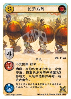 :在你作为守方失去一次争夺后,横置长矛方阵并横置3点影响力,从场中选择并弃除一名进攻角色。