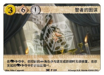 角色参与进攻或防御时无须横置。在你发起的阴谋争夺中你的效能值+1。