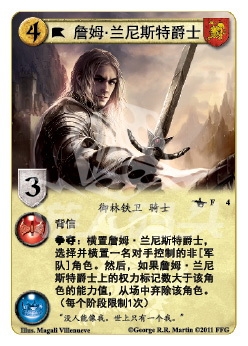 :横置詹姆·兰尼斯特爵士,选择并横置一名对手控制的非[军队]角色。然后,如果詹姆·兰尼斯特爵士上的权力标记大于该角色的能力值,从场中弃除该角色。(每个阶段限制1次)