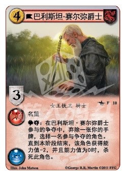 争夺:在巴利斯坦·赛尔弥爵士参与的争夺中,弃除一张你的手牌,选择一名参与争夺的角色。直到本阶段结束,该角色获得能力值-2,并且能力值为0时,杀死此角色。