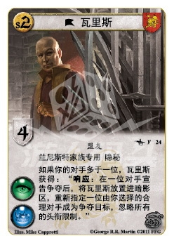 :在一位对手宣告争夺后,将瓦里斯放置进暗影区,重新指定一位由你选择的合理对手成为争夺目标,忽略所有的头衔限制。”