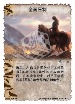 :在你宣告两名或更多都具有[多斯拉克]属性的进攻角色后,在本次争夺中,对手不能宣告非[军队]角色作为防御角色。