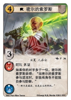如果你的对手多于一位,密尔的索罗斯获得:“当密尔的索罗斯参与进攻时,非独有角色不能独自参与防御。”