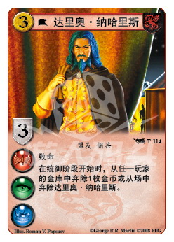 在统御阶段开始时,从任一玩家的金库中弃除1枚金币或从场中弃除达里奥·纳哈里斯。