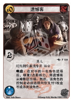:在对手的一名角色进场后,横置2点影响力,将遗憾客从暗影区出场。然后,该角色的控制者必须选择向你支付1枚金币或杀死该角色。