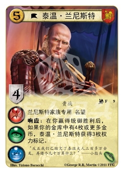:在你赢得统御胜利后,如果你的金库中有4枚或更多金币,泰温·兰尼斯特获得3枚权力标记。
