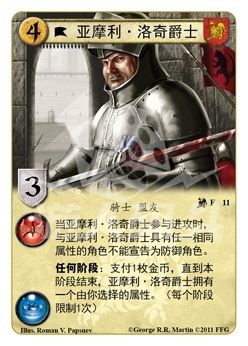 当亚摩利·洛奇爵士参与进攻时,与亚摩利·洛奇爵士具有任一相同属性的角色不能宣告为防御角色。