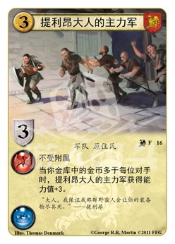 当你金库中的金币多于每位对手时,提利昂大人的主力军获得能力值+3。
