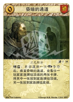 争夺后,横置昏暗的通道,查看任一玩家家族牌组顶端的两张卡牌。将其中一张放到家族牌组顶端,另一张放到家族牌组底端。