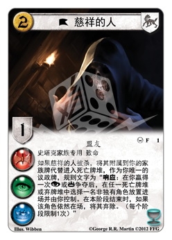 如果慈祥的人被杀,将其附属到你的家族牌代替进入死亡牌堆,作为你唯一的议政牌,规则文字为“