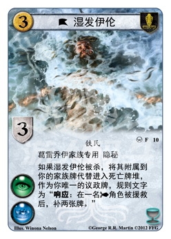 如果湿发伊伦被杀,将其附属到你的家族牌代替进入死亡牌堆,作为你唯一的议政牌,规则文字为“