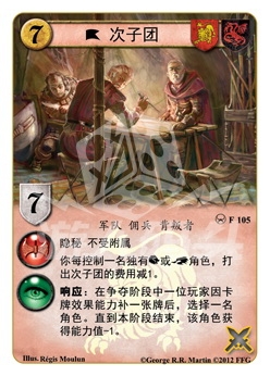 你每控制一名独有兰尼斯特家族坦格利安家族角色,打出次子团的费用减1。