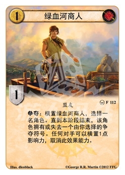 功能说明 争夺:横置绿血河商人,选择一名角色。直到本阶段结束,该角色拥有或失去一个由你选择的争夺符号。任何对手可以横置1点影响力,取消此效果能力。