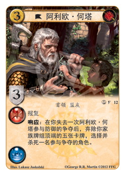 :在你失去一次阿利欧·何塔参与防御的争夺后,弃除你家族牌组顶端的五张卡牌,选择并杀死一名参与争夺的角色。