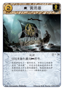 结果伊伦吃了一整年的羊,并将自己的船命名为“黄雨暴”,不过当巴隆知道弟弟打算在船首放上什么样的撞锤时,他威胁要把伊伦吊死在栏杆上。-《群鸦的盛宴》