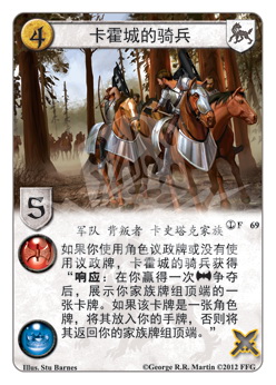 如果你使用角色议政牌或没有使用议政牌,卡霍城的骑兵获得”响应:在你赢得一次军事争夺争夺后,展示你家族牌组顶端的一张卡皮。如果该卡牌是一张角色牌,将其放入你的手牌,否则将其返回你的家族牌组顶端。“