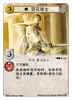 在统御阶段开始时,如果百花骑士未横置,其获得1枚权力标记。