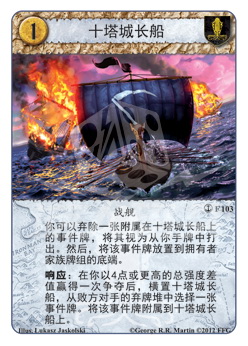 你可以弃除一张附属在十塔城长船上的事件牌,将其视为从你手牌中打出。然后,将该事件牌放置到拥有者家族牌组的底端。
