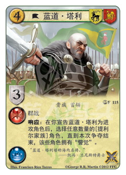 :在你宣告蓝道·塔利为进攻角色后,选择任意数量的[提利尔家族]角色,直到本次争夺结束,该些角色拥有“警觉”。