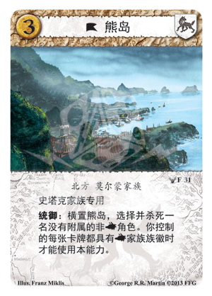 统御:横置熊岛,选择并杀死一名没有附属的非史塔克家族角色。你控制的每张卡牌都具有史塔克家族家族族徽时才能使用本能力。