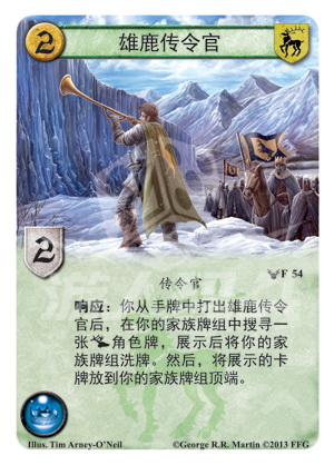 响应:你从手牌中打出雄鹿传令官后,在你的家族牌组中搜寻一张拜拉席恩家族角色牌,展示后将你的家族牌组洗牌。然后,将展示的卡牌放到你的家族牌组顶端。