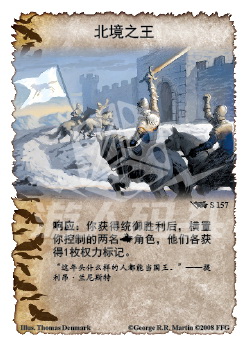 功能说明 响应:你获得统御胜利后,横置你控制的两名史塔克家族角色,他们各获得1枚权力标记。