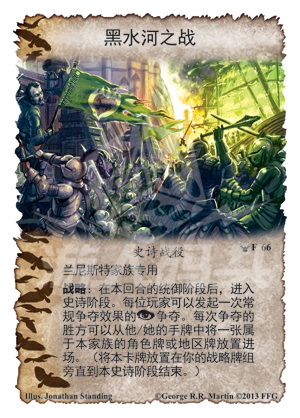 争夺,每次争夺的胜方可以从他/她手牌中将一张属于本家族的角色牌或地区牌放置进场。(将本卡牌放置在你的战略牌组旁直到本史诗阶段结束。)