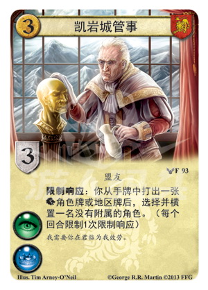 限制响应:你从手牌中打出一张兰尼斯特家族角色牌或地区牌后,选择并横置一名没有附属的角色。(每个回合限制1次限制响应)