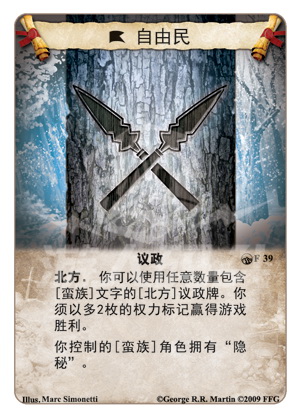 你可以使用任意数量包含[蛮族]文字的[北方]议政牌。你须以多2枚的权力标记赢得游戏胜利。