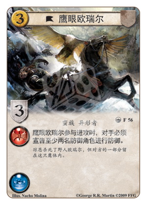 鹰眼欧瑞尔参与进攻时,对手必须宣告至少两名防御角色进行防御。