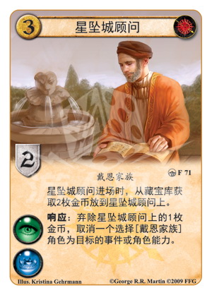 :弃掉星坠城顾问上的1枚金币,取消一个选择[戴恩家族]角色为目标的事件或角色能力。