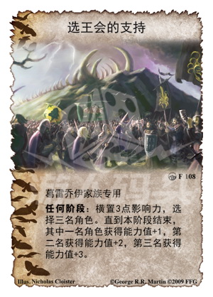 :横置3点影响力,选择三名角色。直到本阶段结束,其中一名角色获得能力值+1,第二名获得能力值+2,第三名获得能力值+3。