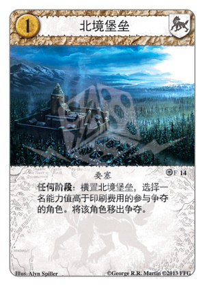功能说明 任何阶段:横置北境堡垒,选择一名能力值高于印刷费用的参与争夺的角色。将该角色移出争夺。