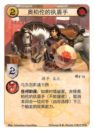 任何阶段:如果时值盛夏,弃除奥柏伦的执盾手(不能援救),取消本回合一位对手(由你选择)下三个触发的效果能力。
