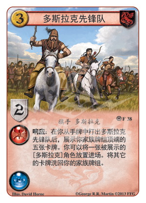 :在你从手牌中打出多斯拉克先锋队后,展示你家族牌组顶端的五张卡牌。你可以将一张被展示的[多斯拉克]角色放置进场。将其它的卡牌洗回你的家族牌组。