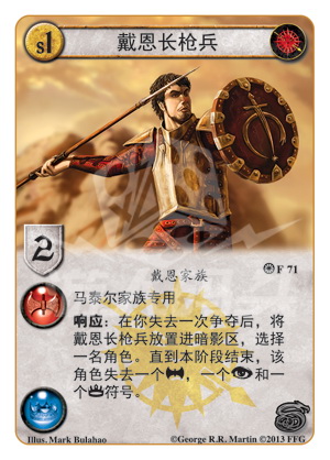 :在你失去一次争夺后,将戴恩长枪兵放置进暗影区,选择一名角色。直到本阶段结束,该角色失去一个