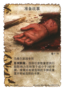 功能说明 任何阶段:选择任意数量提供印刷影响力总和等于或小于3的卡牌。横置所有被选择的卡牌或重置所有被选择的卡牌。