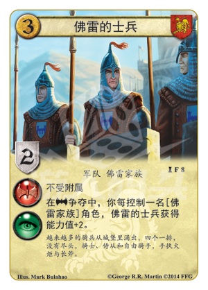 军事争夺争夺中,你每控制一名[佛雷家族]角色,佛雷的士兵获得能力值+2。