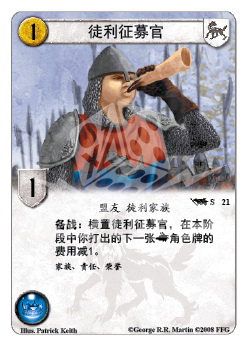 功能说明 备战:横置徒利征募官,在本阶段中你打出的下一张史塔克家族角色牌的费用减1。