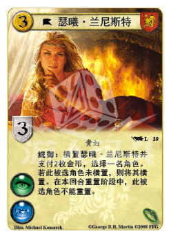 :横置瑟曦·兰尼斯特并支付2枚金币,选择一名角色。若此被选角色未横置,则将其横置。在本回合重置阶段中,此被选角色不能重置。